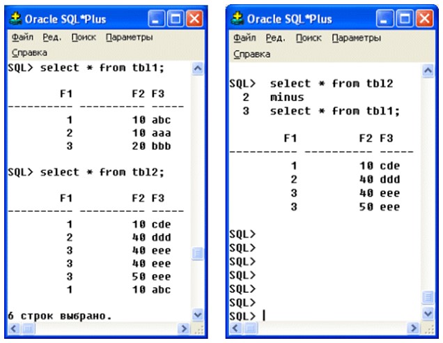 INTERSECT және EXCEPT жазбалары SQL-92 толығымен сәйкестік деңгейінде ғана орындалады. Кейбір ДҚБЖ EXCEPT жазбасының орнына MINUS опциясын алады ( сурет. 4.6).