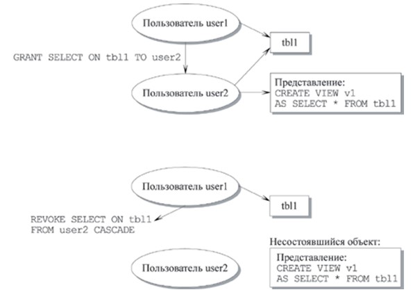 Егер бір артықшылық WITH GRANT OPTION опциясымен бірге бір қолданушыдан келесі қолданушыға бірнеше рет реттілігімен берілетін болса, онда тәуелді артықшылықтың тізбегі құрылады. CASCADE және RESTRICT сөздері артықшылықтарда осы тізбек түйіндерінің біреуін жойған жағдайда қалай пайда болатынын анықтайды.