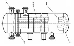 1 – shell; 2 – tubes; 3 – tubes sheet; 4 – covers; 5 – outlet; 6 – lens expansion joints; 7 – U-shaped tubes; 8 – floating head