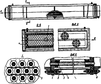The heat exchange section of air cooler exchanger consists of four, six or eight rows of tubes 3 (Figure 1.28), which are arranged at the vertices of equilateral triangles in two tube sheets 1. Tubes are fastened by flare or flare with welding. Section 4 is reinforced by metal frame to ensure rigidity of the tube bundle. However, the operation of the nuts on the studs 2, connecting the sheet to the frame, must be unscrewed a distance greater than the possible temperature extension tubes. In the tube bundle each tube can has an individual deflection. To avoid the contact of the ribs of the top row of tubes with the ribs of tubs of the bottom row of tubes between adjacent rows at several locations along the tube, which are placed spacers 15 with width of 5 mm, which are made from the aluminum tape with a thickness of 2 mm.
