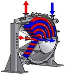 Spiral heat exchangers have received in the industry is relatively widespread, due to a number of important advantages compared to other types of heat exchangers. Spiral heat exchangers can be fabricated from any roll of material to be cold-worked and welded. Heat exchangers are compact, their design allows for complete counterflow. Cross-sectional area throughout the length of the channel remains unchanged, and the flow has no abrupt changes in direction, so that contamination of the surface of the spiral heat exchanger is less than the heat exchangers of other types, in addition, a number of designs allows for relatively easy cleaning in the case, is not required for removal sludge mechanical action. Hydraulic resistance of spiral heat exchangers at the same fluid velocity is less than that of shell and tube.