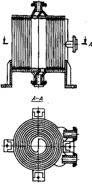 Spiral heat exchangers of various designs have been used for liquid-liquid systems, for liquid-vapor systems as condensers, evaporators and the heaters for heating and cooling of gas-vapor mixtures. Spiral heat exchangers can be arranged a special design with the distillation column and used as reflux condensers. One of the purposes of spiral heat exchangers - heating and cooling of highly viscous liquids. Since the viscous fluid flows in one channel, the problem persists even distribution of the viscous fluid through the tubes (Figure 1.37). Spiral heat exchangers can be successfully applied to liquids and sludges containing fiber materials. The use of special heat exchanger for gases is limited to small cross-section channel.