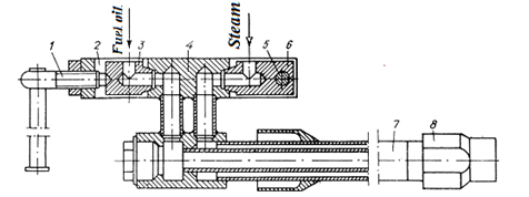 1 – clamping screw; 2 – bracket; 3 – the steam nozzle; 4 – block; 5 – the fuel nozzle; 6 – the handle; 7 – barrel; 8 – atomizing burner