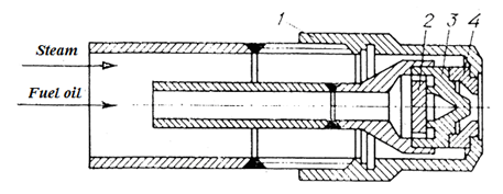 In order to expand the control range nozzles are supplied with steam swirls. Steam through the outer tube comes to channel coupling nut, then to the steam channels and the swirl, leaving a twisted thread, takes part in the spraying of fuel oil. Spattering parts are tightened by union nut.