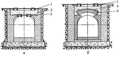 Setting kilns. Setting the furnace includes lining layers of a shaped refractory bricks, insulation up to 250 mm and an outer layer of thermal insulation, sealed from the outside metal casing. Refractory materials according to the melting point are divided into three groups: refractory (melting point = 1580 ... 1770 °C), high fire preventive (m.p. = 1770 ... 2000 °C) and high refractoriness (m.p.> 2000 °C). For the lining of refractory fireclay bricks used for insulation - diatomaceous bricks, various types of filling, asbestos cardboard, mineral wool. To allow for thermal expansion temperature provides masonry joints. Versions of suspended arches are shown in Figure 2.24.