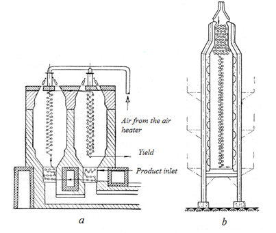 b) with lateral furnace chamber and convective upward flow of gas in the radiant chamber |