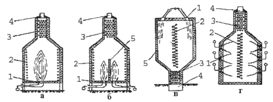 1 – nozzle; 2 – pipe coil; 3 – convection tube; 4 – output; 3 – convection pipe bundle; 4 – chimney