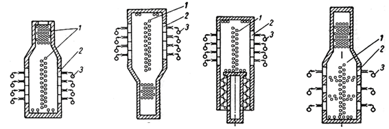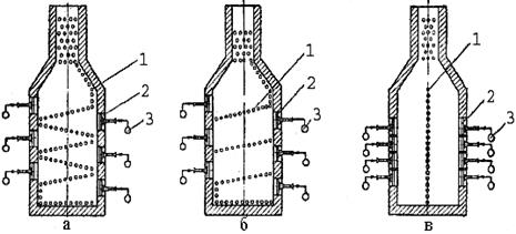 In furnaces (Figure 2.33, a, b, c) injector axis is perpendicular to the axis of the radiant tubes. The furnaces (Figure 2.33, d, e, f, g) axis parallel pipes and nozzles, which leads to an undesirable uneven distribution of thermal stress along the length of the tubes.