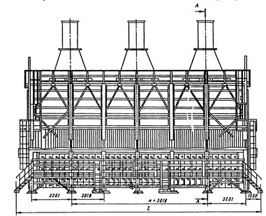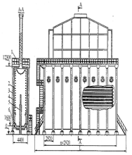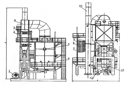 1– fan; 2 – convection chamber; 3 – a ladder platform; 4 – flue pipe; 5 and 6 – the exhaust, and a viewing window; 7 – radiant heating coil; 8 – grid plate; 9 – carcass; 10 – chimney; 11 – air heater; 12 – flue exhaust