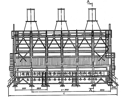 Figure 2.45 –Tubular double chamber furnace with radiant panel walls of flameless burners with a central double-row tube screen (section A-A)