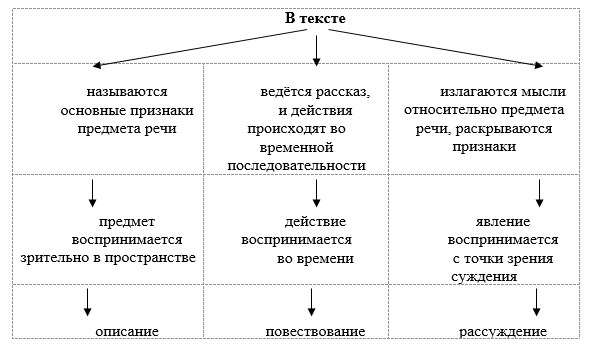 В зависимости от коммуникативной задачи выделяют функционально-смысловые типы речи – описание, повествование, рассуждение. Схематично это выглядит следующим образом: