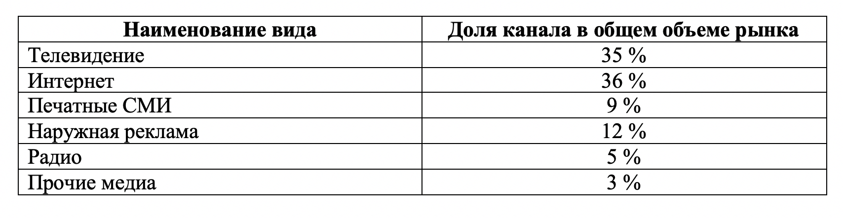Таблица 1 – Доли различных каналов распространения рекламы в общем объёме рынка рекламы в 2015 году