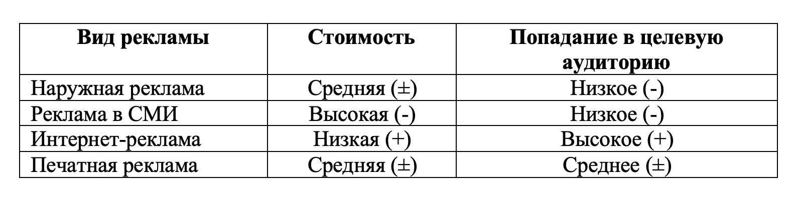 Таблица 2 – Соотношение стоимости и эффективности рекламы