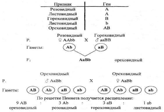 Расщепление 9 : 3 : 3 : 1. Известны и такие случаи, когда каждый из двух комплементарных генов способен проявлять свое действие самостоятельно. Одним из таких примеров является наследование формы гребня у кур. Каждая из доминантных аллелей генов обусловливала развитие гребня определенной формы (гороховидной или розовидной), а взаимодействие этих генов определяло развитие новой формы гребня – ореховидной (рисунок 14).