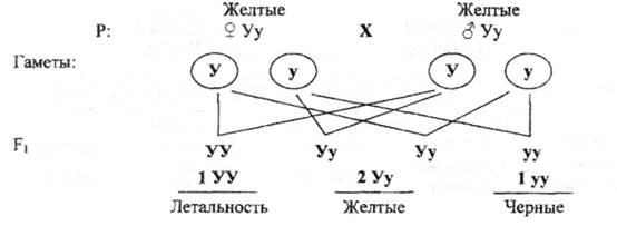 У мышей ген доминантной желтой пигментации шерсти – У обладает летальным действием в гомозиготном состоянии и приводит к эмбриональной гибели мышей, а его аллель – у вызывает черную пигментацию и обуславливает жизнеспособность (рисунок 17).