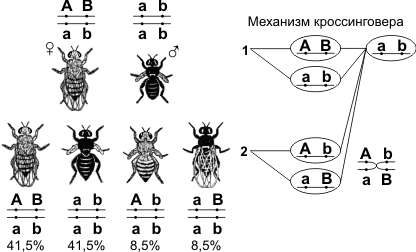 Скрещивая мушку дрозофилу с серым телом и нормальными крыльями с мушкой, имеющей темную окраску тела и зачаточные крылья, в первом поколении Морган получал гибриды, имеющие серое тело и нормальные крылья (ген, определяющий серую окраску брюшка, доминирует над темной окраской, а ген, обусловливающий развитие нормальных крыльев, – над геном недоразвитых). При проведении анализирующего скрещивания самки F1 с самцом, имевшим рецессивные признаки, теоретически ожидалось получить потомство с комбинациями этих признаков в соотношении 1:1:1:1. Однако в потомстве явно преобладали особи с признаками родительских форм (41,5 % – серые длиннокрылые и 41,5 % – черные с зачаточными крыльями), и лишь незначительная часть мушек имела иное, чем у родителей, сочетание признаков (8,5 % – черные длиннокрылые и 8,5 % – серые с зачаточными крыльями). Такие результаты могли быть получены только в том случае, если гены, отвечающие за окраску тела и форму крыльев, находятся в одной хромосоме (рисунок 19).