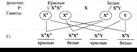 Анализируя наследование признаков окраски глаз у дрозофилы, Т. Морган пришел к выводу о наличии особого типа наследования – сцепленного с полом. Цитологической основой такого наследования является локализация генов в половых хромосомах. Наследование таких признаков будет зависеть от пары половых хромосом в мейозе при гаметообразовании.