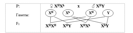 Рождение сына с гемофилией (генотип XhY) в этой семье указывает на то, что его здоровая мать имела ген гемофилии. Её генотип – XHXh.