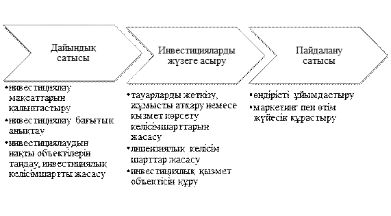 Инвестициялық процестің нақты барысы инвестициялау объектілерімен және инвестициялау түрлерімен (нақты және қаржылық инвестициялармен) анықталады. 1.3-суретте көрсетілгендей, инвестициялық процестің негізгі үш сатысы бар.
