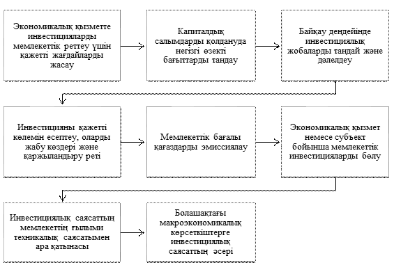 Мемлекеттік инвестициялық саясаттың жасауда аталған қағидаттарды жүзеге асыруда ең маңызды мәнді оны реттеуде ұйымдастыру механизмі алады [3].