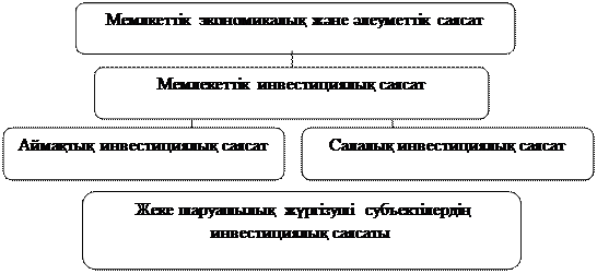 Мемлекеттік инвестициялық саясаттан тыс, салалық, аймақтық инвестициялық саясат және кәсіпорынның инвестициялық саясатты бөліп қарастырады. 3.3-суреттен байқалғандай, олар барлығы тығыз байданысты, алайда анықтаушы ең бастысы болып мемлекеттік инвестициялық саясат табылады, себебі аймақтық, салалық және макро деңгейде инвестициялық қызметті жүзеге асырушы сол болып табылады [4].