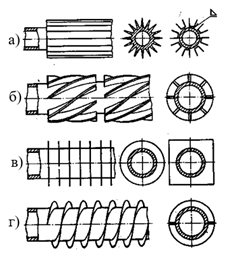 Применяют трубы с продольными (рисунок 1.12, а) и разрезными (рисунок 1.12, б) ребрами, с поперечными ребрами различного профиля (рисунок 1.12, в). Оребрение на трубах можно выполнить в виде спиральных ребер (рисунок 1.12, г), иголок различной толщины и др.