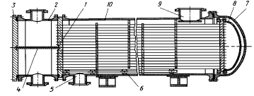 На входе теплообменной среды в межтрубное пространство предусмотрен отбойник 9 - круглая или прямоугольная пластина, предохраняющая трубы от местного эрозионного изнашивания.