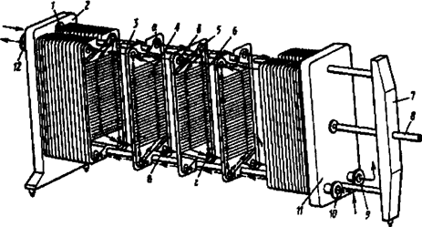 Разборные пластинчатые теплообменники изготовляют в трех исполнениях, в том числе на консольной раме, на двух-опорной раме, на трех-опорной раме. Разборный пластинчатый теплообменник на двух-опорной раме (показан на рисунке 1.30). Аппарат состоит из ряда теплообменных пластин 4, размещенных на верхней и нижней горизонтальных штангах 3. Концы штанг закреплены в неподвижной плите 2 и на стойке 7. Нажимной плитой 11 и винтом 8 пластины сжимаются, образуя теплообменную секцию.