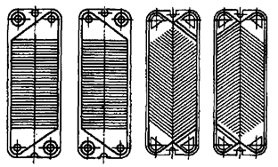 Серийно выпускаемые пластинчатые теплообменники комплектуют пластинами, штампованными из листового металла толщиной 1 мм. Гофры пластин обычно имеют в сечении профиль равностороннего треугольника высотой 4...7 мм и основанием длиной 14...30 мм (для вязких жидкостей до 75 мм). Гофры выполняют горизонтальными, «в елочку», под углом к горизонтали и др. Материал пластин – оцинкованная или коррозионно-стойкая сталь, титан, алюминий, мельхиор.