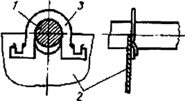 В разборных теплообменниках пластины 2 обычно крепят скобой 3 на верхней штанге 1 (рисунок 1.32). Нижняя штанга не несет нагрузки от массы пластин и служит лишь для фиксации их в заданном положении. Такое закрепление пластин позволяет легко извлечь их из пакета или вставить в него без снятия подвижной плиты и остальных пластин.