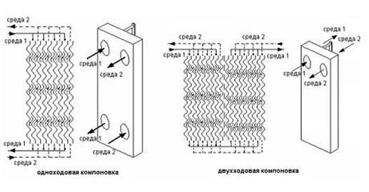 - Одноходовая компоновка теплообменника это когда теплоноситель сразу делится на параллельные потоки, проходит по всем каналам пластин и, сливаясь в один канал, поступает в порт для вывода теплоносителя.