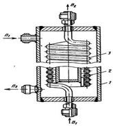 Змеевиковые теплообменные аппараты - это аппараты, в которых теплообменная поверхность выполнена в виде объемного или плоского змеевика, расположенного в корпусе теплообменного аппарата, а теплоноситель с высоким давлением подается в трубное пространство змеевика. Эти аппараты применяют в химической, нефтехимической, газовой, а также в холодильной и пищевой отраслях промышленности. Теплообменные аппараты такого типа определяют как аппараты нежесткой конструкции с компенсацией температурных напряжений в результате свободного удлинения змеевика.
