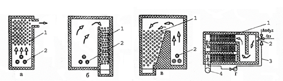 На рисунке 2.32 приведены печи конвективного типа с верхним (рисунок 2.32 (а)) и нижним (рисунок 2.32 (б, в, г)) отводом дымовых газов. Горизонтальное расположение змеевика (рисунок 2.32 (а, б и в)) позволяет сравнительно легко удалить продукт из труб и продуть их при плановых остановках печи на ремонт, в аварийных ситуациях и т.п. Вертикальное расположение змеевика позволяет значительно проще крепить и ремонтировать трубы. С целью уменьшения прогара труб конвективный змеевик отделен от топки перевальной стеной (2.32 (б, в, г)). Уменьшающееся по ходу движения дымовых газов сечение конвективной камеры обеспечивает более равномерную теплонапряженность поверхности нагрева для различных рядов труб.