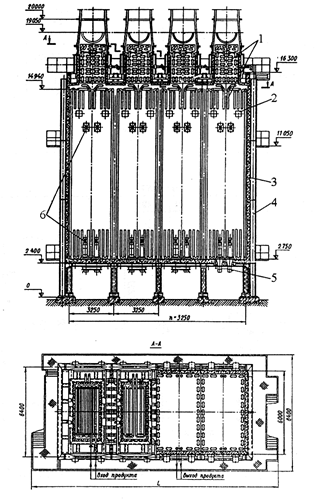 Рисунок 2.45 – Трубчатая двухкамерная печь с излучающими стенами из беспламенных панельных горелок с центральным двухрядным трубным экраном (разрез А-А).