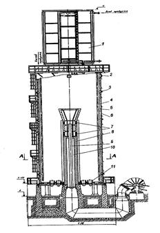 Рисунок 2.50 – Трубчатая однокамерная цилиндрическая печь с кольцевой камерой конвекции, вертикальными трубами в камерах радиации и конвекции