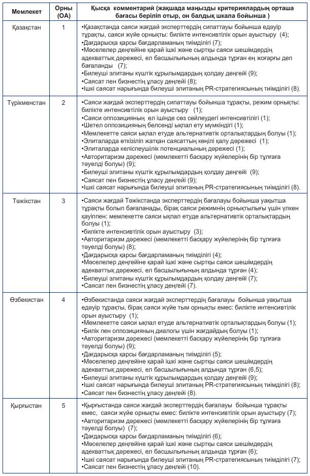 Бірлескен евразиялық эксперт желісі (JEEN, Joint Eurasian Expert Network) 2010 жылы Орталық Азия елдерінің саяси режимдерінің тұрақтылық рейтингісін жарыққа шығарды (1 кесте).