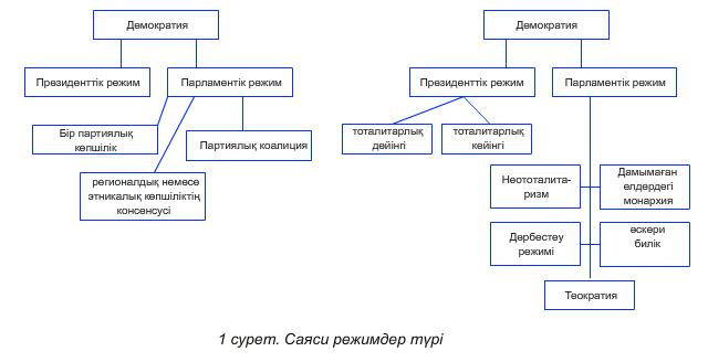 Режимдердің қабылданған классификациясы оларды демократиялық, авторитарлық және тоталитарлық бөлу болып келеді (1 сурет).
