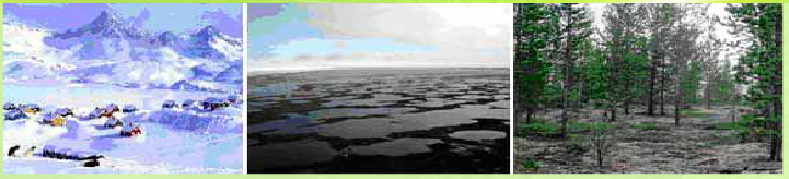Приполярные районы Земли. Слева направо: арктическая пустыня (Гренландия), тундра (Якутия), лесотундра (Хибины)
