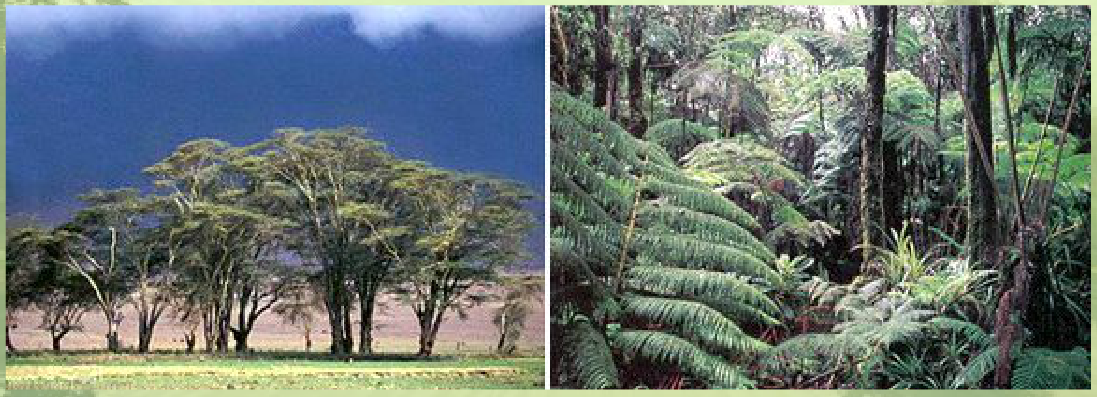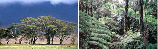 Субэкваториальные и экваториальный пояса. Слева направо: саванна (Танзания), влажный лес (Южная Америка)