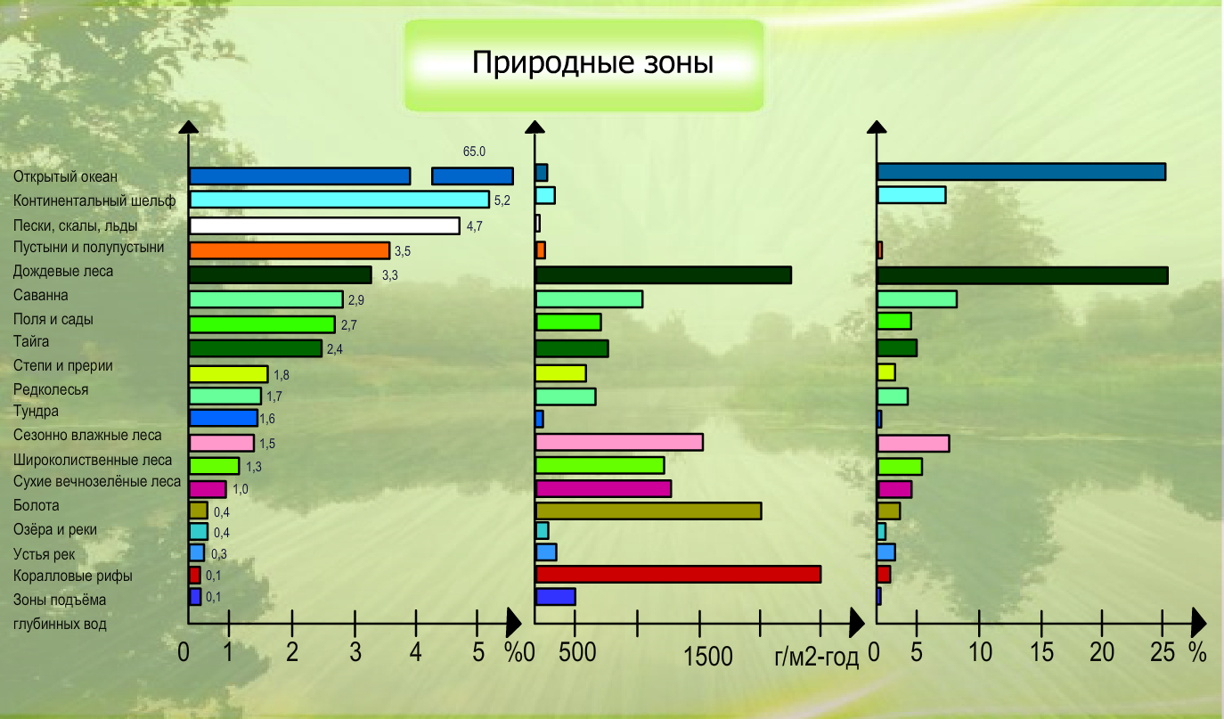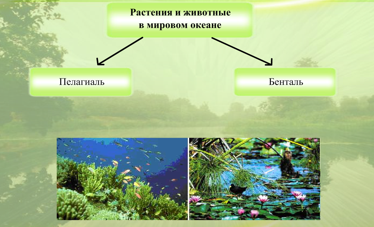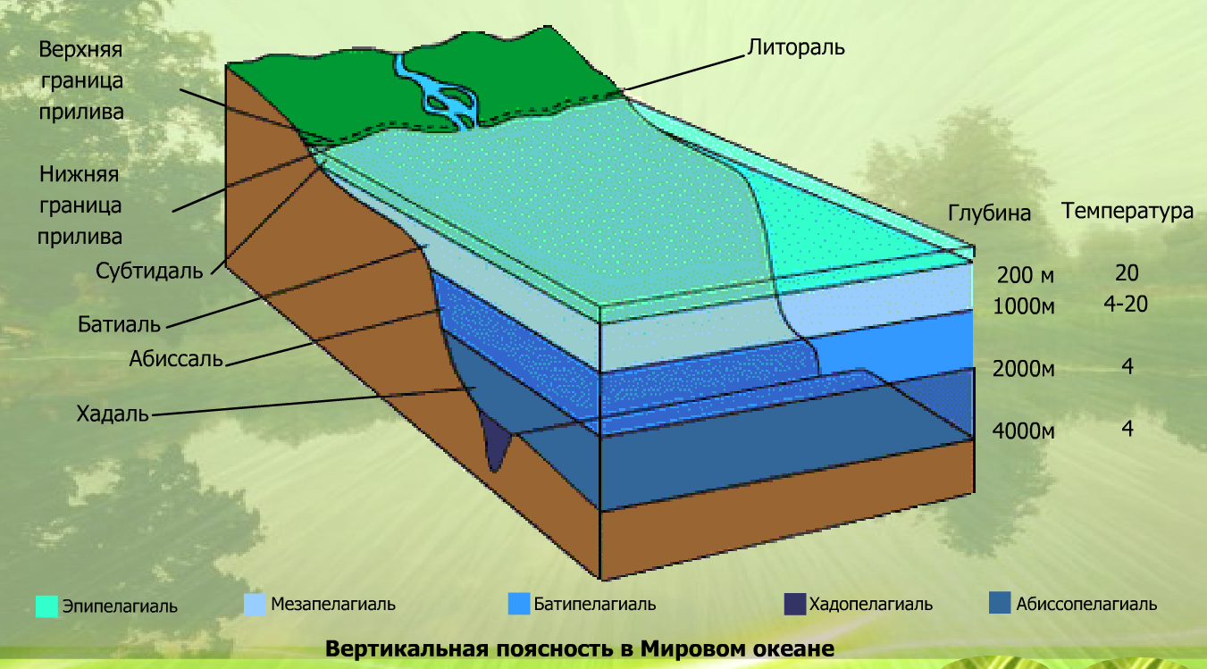 Живые организмы населяют не только сушу, но и Мировой океан. В океане обитает порядка десяти тысяч видов растений и сотни тысяч видов животных (в том чиле более 15 тысяч видов позвоночных). Растения и животные заселяют в мировом океане две сильно отличающиеся друг от друга области – пелагиаль (поверхностные слои воды) и бенталь (морское дно). Широтные зоны хорошо выражены только в приповерхностных водах океана; с увеличением глубины влияние солнца и климата уменьшается, а температура воды приближается к характерным для толщи океана +4 °С.