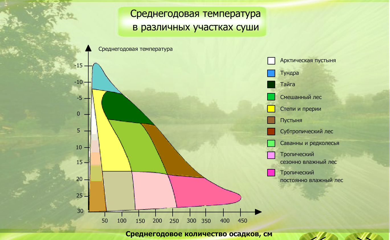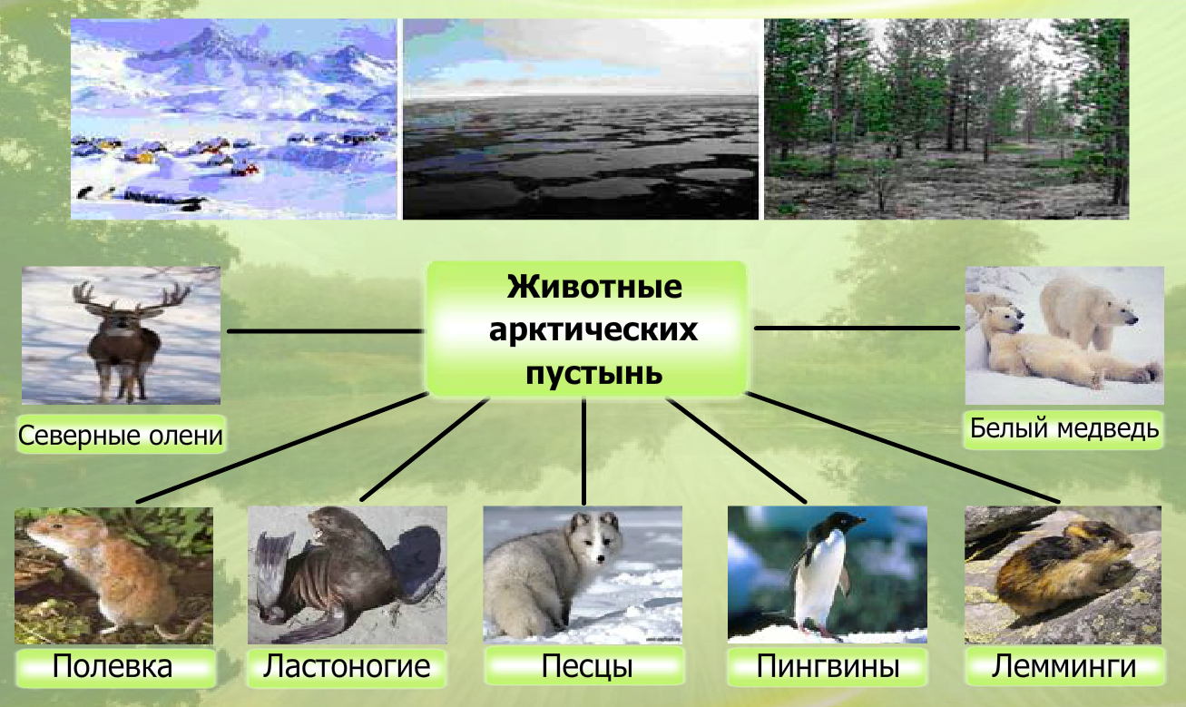 Рассмотрим основные биогеографические зоны суши. Территорию вокруг полюсов охватывают холодные арктические (в Южном полушарии – антарктические) пустыни. Они отличаются крайне суровым климатом, обширными ледниковыми покровами и каменистыми пустынями, неразвитыми почвами, скудостью и однообразием живых организмов. Животные арктических пустынь связаны, в основном, с морем – это белый медведь, ластоногие, в Антарктиде – пингвины.