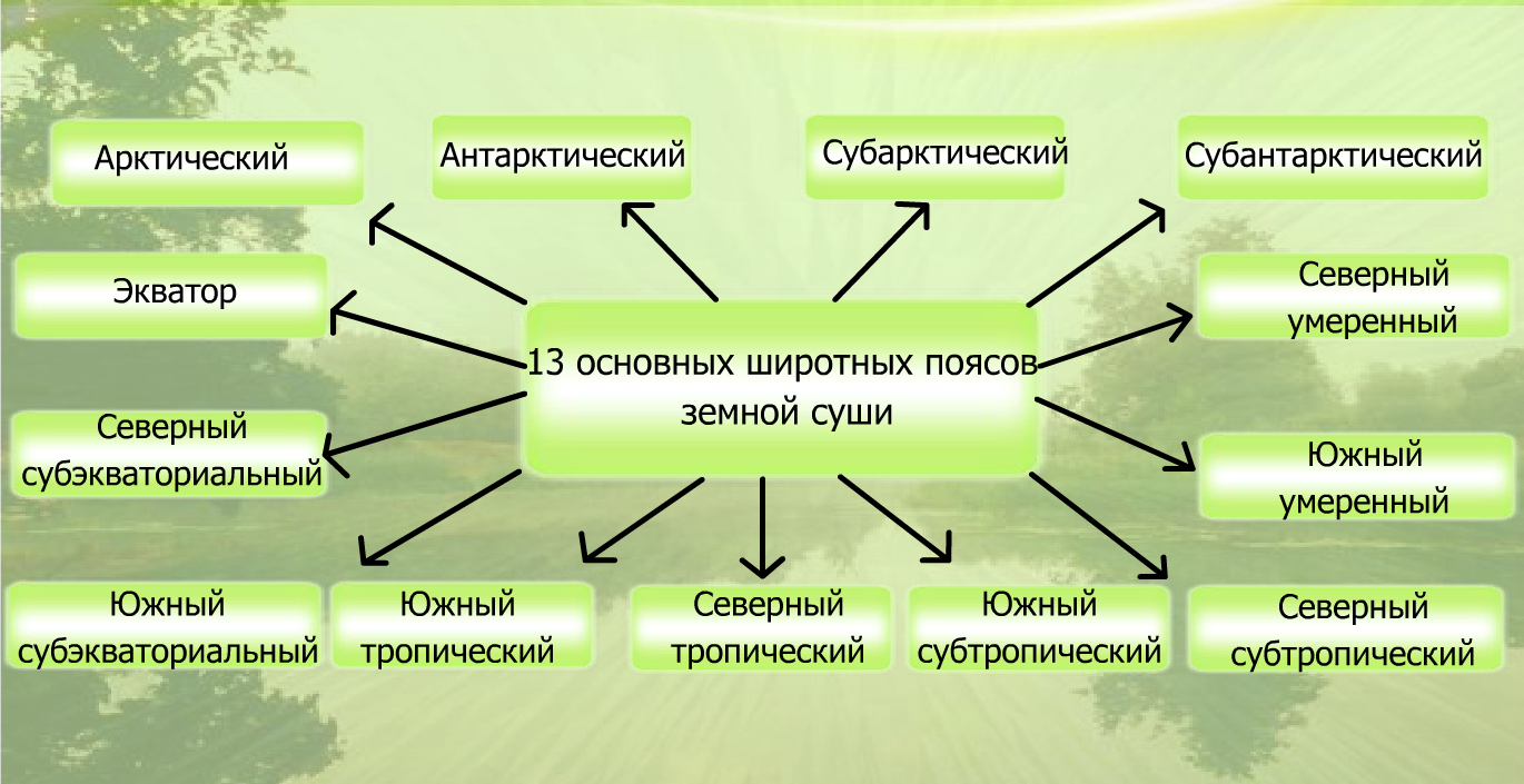 Земная суша разделена на 13 основных широтных поясов: арктический и антарктический, субарктический и субантарктический, северный и южный умеренные, северный и южный субтропические, северный и южный тропические, северный и южный субэкваториальные, экваториальный.