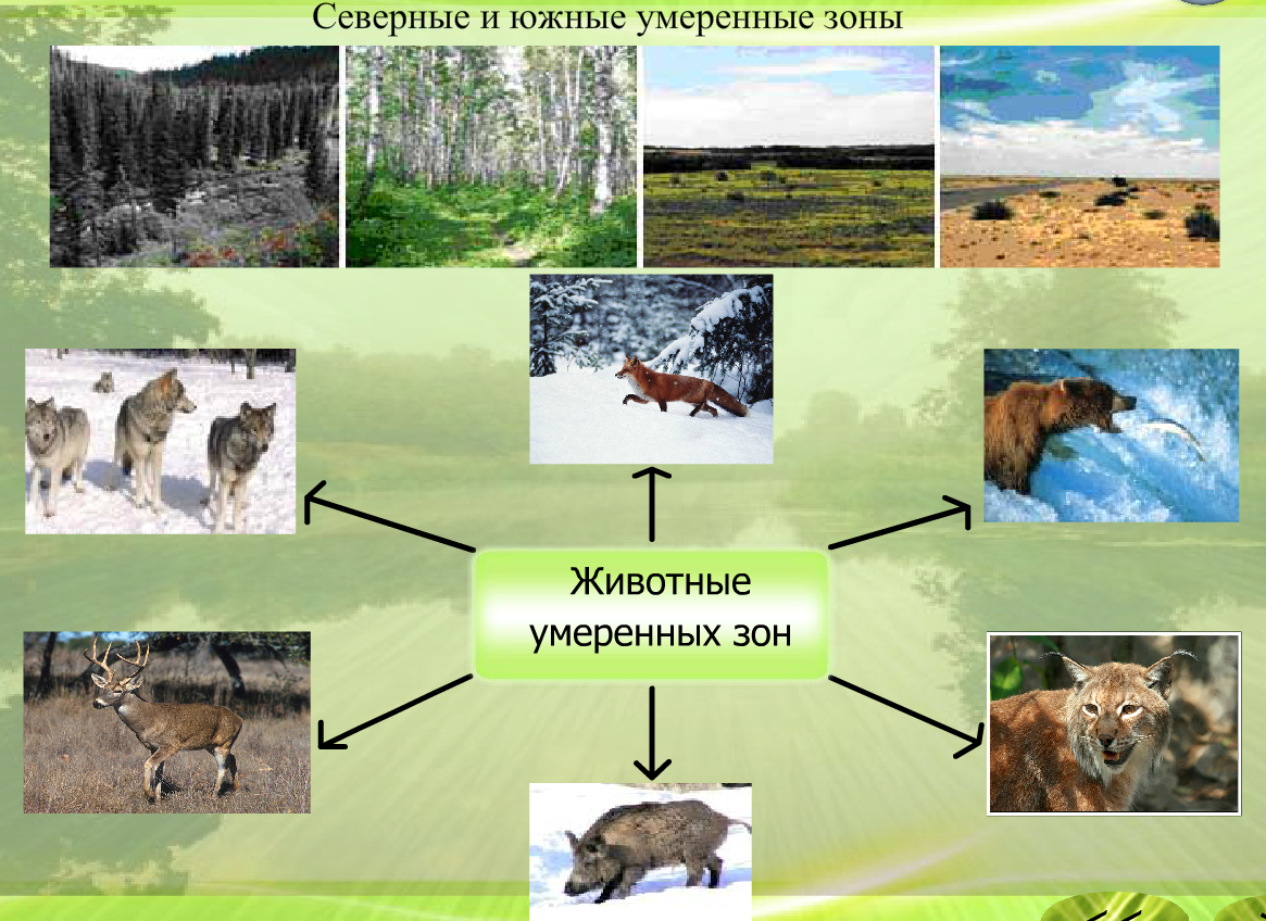 Южнее лесотундры начинаются леса умеренной зоны; сначала хвойные (тайга), затем – смешанные, и наконец, широколиственные (Южный умеренный пояс практически полностью покрывает мировой океан). Умеренные леса занимают громадные территории в Евразии и Северной Америке. Климат здесь уже значительно теплее, и видовое разнообразие больше в несколько раз, чем в тундре. На подзолистых почвах доминируют крупные деревья – сосна, ель, кедр, лиственница, южнее – дуб, бук, берёза. Среди животных распространены хищные (волк, лиса, медведь, рысь), копытные (олени, кабаны), певчие птицы, отдельные группы насекомых.