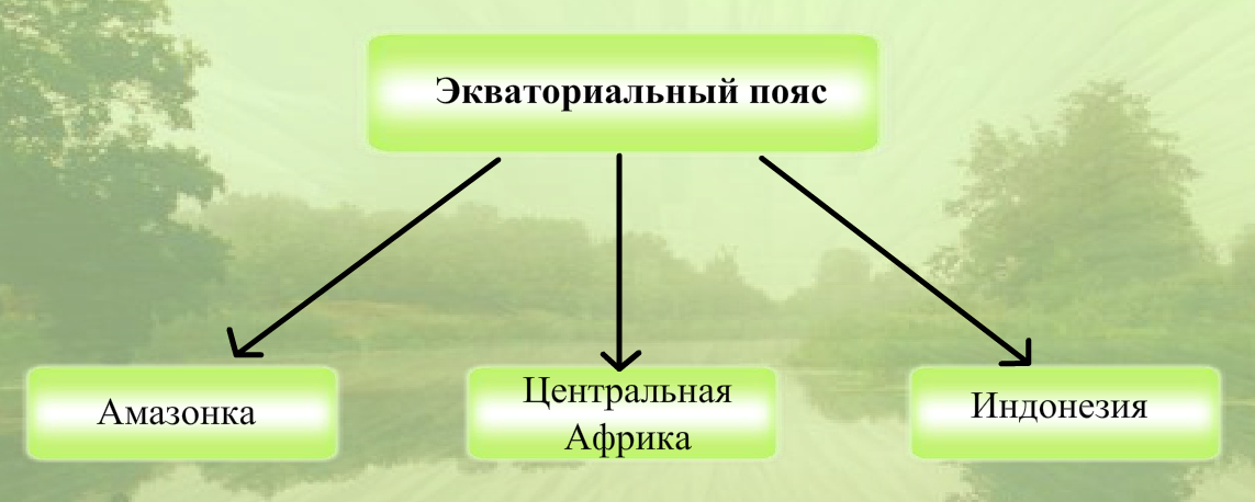 Ближе всего к экватору расположен экваториальный пояс (бассейн Амазонки, Центральная Африка, Индонезия). Обилие осадков и высокая температура обусловили здесь наличие вечнозелёных влажных лесов (в Южной Америке такой лес называется гилеей). Экваториальный пояс – рекордсмен по разнообразию видов животных и растений.