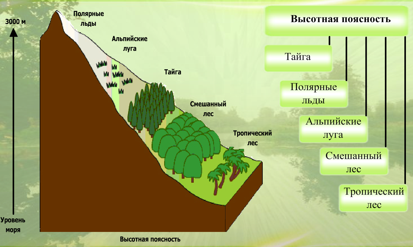 Похожие закономерности наблюдаются и в смене биогеографических зон в горах – высотной поясности. Она обусловлена изменением температуры, давления и влажности воздуха с увеличением высоты местности. Полного тождества между высотными, с одной стороны, и широтными, с другой стороны, поясами, однако, нет. Так, присущей типичной тундре смены полярных дня и ночи лишены её высокогорные аналоги в более низких широтах, а также альпийские луга. Наиболее сложные спектры высотных поясов свойственны высокогориям, находящимся близ экватора. К полюсам уровни высотных поясов снижаются, а их разнообразие уменьшается. Изменяется спектр высотных поясов и при удалении от берега моря.