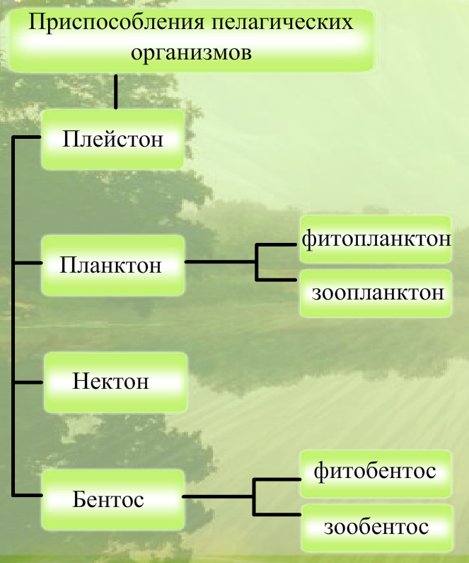 Пелагиаль – толща воды океанов, морей и озёр – делится на вертикальные зоны по освещённости (хорошо освещённая, сумеречная и лишённая света) и по распределению жизни (поверхностная, переходная и глубоководная). Для пелагических организмов характерны схожие приспособления, обеспечивающие плавучесть. Они разделяются на пассивно плавающих на поверхности воды (плейстон: саргассовые водоросли, сифонофоры и др.) или в её толще (планктон) и на активно плавающих организмов, способных противостоять силе течения (нектон: рыбы, кальмары, водные змеи и черепахи, пингвины, китообразные, ластоногие, а также крупные ракообразные). Нектон отличает вытянутая форма тела с наименьшим лобовым сопротивлением воды при движении.