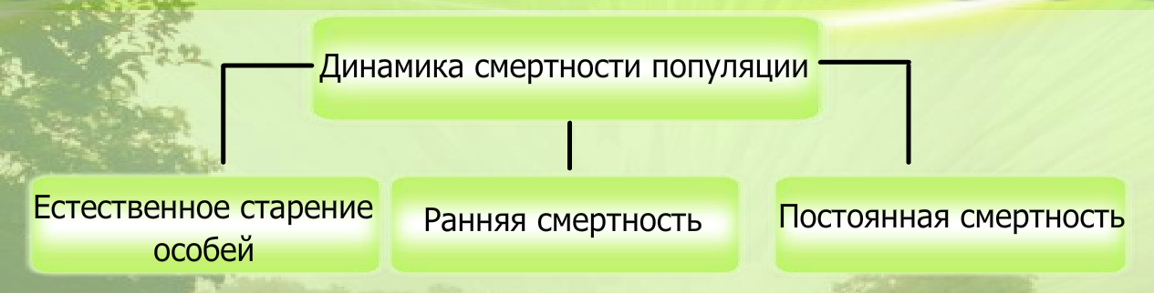 Учёным, исследующим динамику популяций, важно бывает знать не только общую смертность в популяции, но и количество особей, погибающих до достижения половой зрелости. Условием стабильности популяции является тот факт, что до половой зрелости доживают два потомка от каждой пары. Динамику смертности популяции в зависимости от возраста отображают на кривых выживания. Существуют три основных типа этих кривых: когда главным фактором смертности является естественное старение особей (на рисунке эта кривая обозначена буквой А), когда в популяции высока ранняя смертность (Б) и, наконец, когда смертность постоянна в течении всей жизни организмов (В). Кривые выживания конкретных видов могут занимать промежуточные положения между этими крайними формами