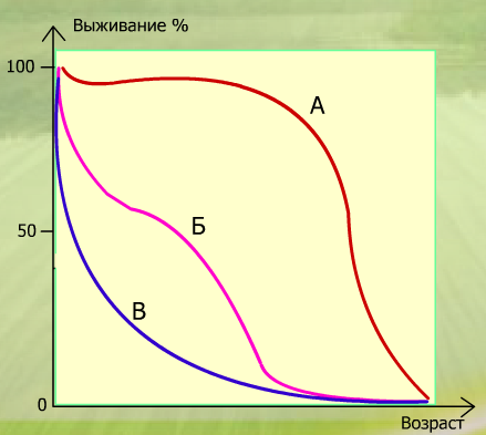 Постоянная смертность - наконец, когда смертность постоянна в течении всей жизни организмов (В). Кривые выживания конкретных видов могут занимать промежуточные положения между этими крайними формами.