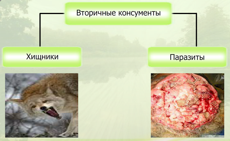 Вторичные консументы – это плотоядные организмы: хищники либо паразиты. В типичных пищевых цепях хищники оказываются крупнее на каждом уровне, а паразиты – мельче.