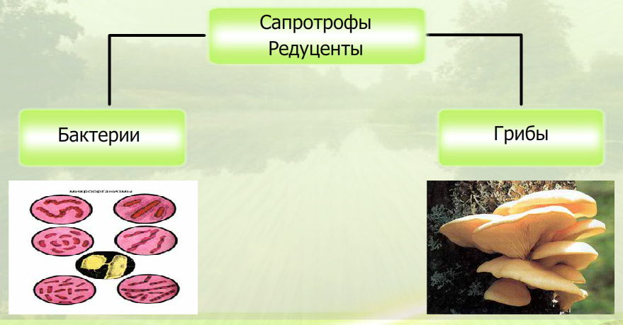 Редуценты (также деструкторы, сапротрофы, сапрофиты, сапрофаги, детритофаги) — организмы, разрушающие остатки мёртвых растений и животных (черви, мокрицы, раки, сомы, грифы) и превращающие их в неорганические соединения (бактерии, грибы).
